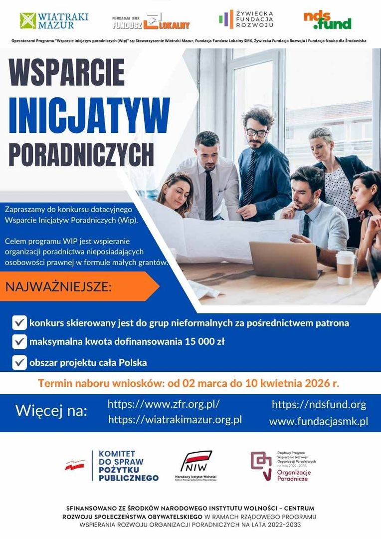 Program „Wsparcie inicjatyw poradniczych” jest finansowany ze środków Narodowego Instytutu Wolności - Centrum Rozwoju Społeczeństwa Obywatelskiego w ramach Rządowego Programu Wspierania Rozwoju Organizacji Poradniczych na lata 2022-2033.